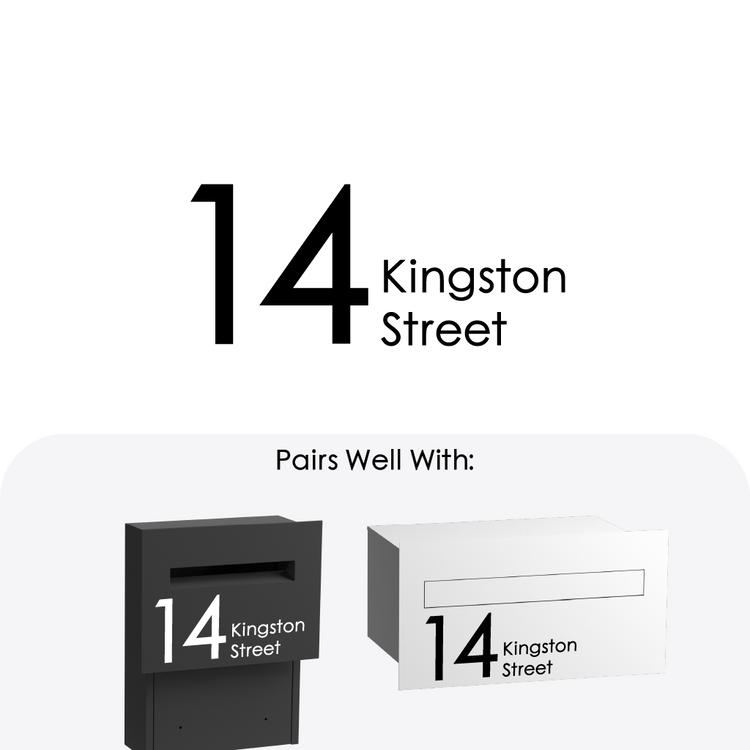 A clean, number-forward address decal made from UV-resistant commercial grade vinyl, designed for balanced proportions and clear readability on letterboxes and entry panels.