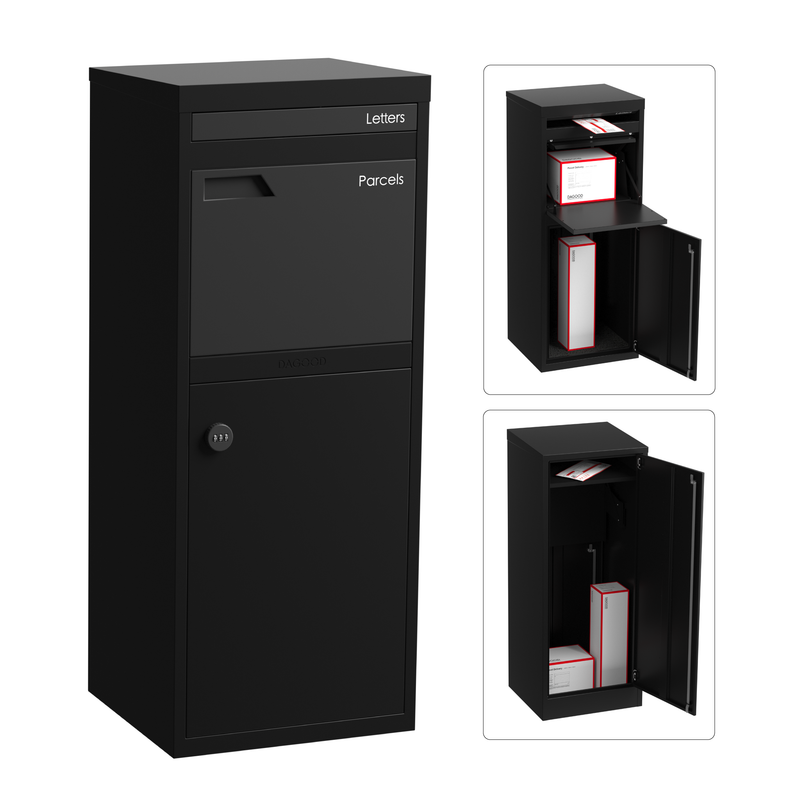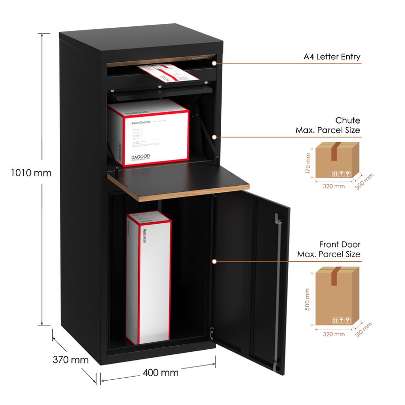 Parker separates letters and parcels to keep deliveries organised and secure. Letters are posted through the A4 mail slot into a separate upper letter compartment, remaining accessible via the rear door. Medium parcels are delivered through the top chute, while larger parcels are placed into the lower compartment.
